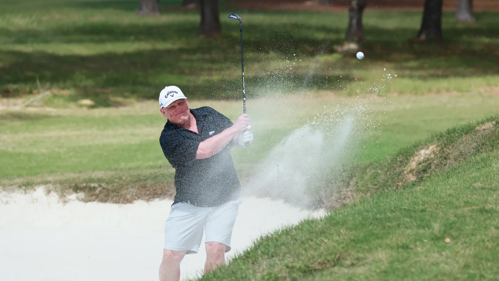 Hockey legend Brett Hull blasts his way out of the sand at Fallen Oak. Hull finished the first round in a tie for 14th place with a score of 32 on the modified Stableford system.